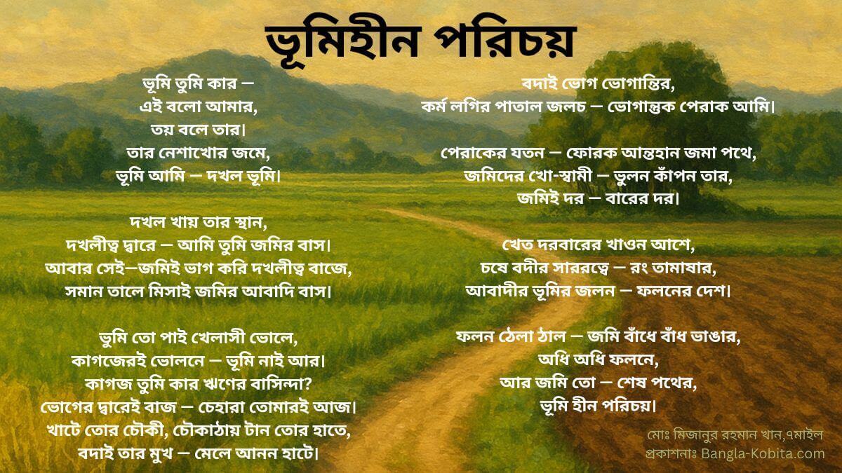 নতুন বাংলা কবিতা এখন শুধু কেবল লোকদের মন জোগানোর শব্দের খেলা নয়—এটি ভূমিহীন মানুষের পরিচয় নিয়ে নতুন কবির আধুনিক কবিতা। যার ভিতরে ফুটে উঠেছে দখলদারিত্ব-বিরোধী ও জমির অধিকারহীনতার গভীরতম বাস্তবতার কাহিনি। আজ আমি ভূমিহীনতার বেদনা নিয়ে “বাংলাদেশে ভূমি-বঞ্চনা কবিতা” কিংবা “বাংলা কবিতা ভূমি দখল এবং অধিকার”–এর মতো মানবিক সমাজবোধ প্রশ্নগুলোকে নতুন কবিতা লেখার কৌশলে তুলে ধরেছি। তাই নতুন বাংলা কবিতা হচ্ছে ভূমি সমস্যা নিয়ে লেখা, এবং ভূমিহীন পরিচয় বাংলা কবিতা—এই লাগাতার ধারাটি হয়ে উঠছে আজকের আমার সাহিত্যিক পরিবর্তনের মুখ-বলি। তাই আমার “ভূমিহীন পরিচয়” কবিতাটি নতুন বছরের বাংলা কবিতা বা notun bochorer bangla kobita হিসাবে পাঠকদের নতুন কিছু জানার অর্থ তৈরি করে; কারণ এতে মিশে আছে জমির প্রতি মানুষের গভীর ভালোবাসার টান, এবং ভোগ দখলের বেড়াজালে পরিচয় হারানোর দীর্ঘশ্বাস।